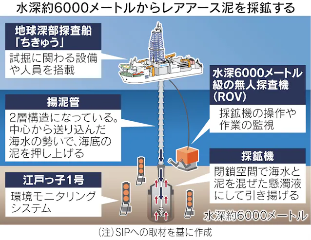 中心となるのはSIPで、海洋研究開発機構(JAMSTEC)の地球深部探査船「ちきゅう」を使って26年1〜2月にかけて、南鳥島沖のEEZ内で、水深約6000メートルからレアアース泥の試掘をする。